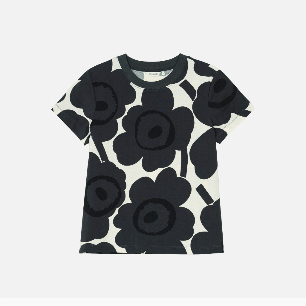 Heleys-t-paita on valmistettu puuvillatrikoosta ja siinä on niukka istuvuus, suora leikkaus sekä Unikko -kuosi. T-paidassa on yksivärinen resori pyöreässä pääntiessä.