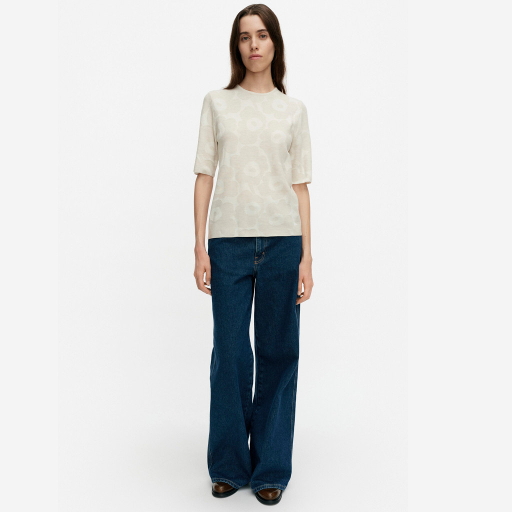 Kertyä-neuletopissa on niukka istuvuus, suora leikkaus sekä jacquard-kudottu Unikko-kuosi. Neuletopissa on resorikantilla viimeistelty pyöreä pääntie sekä kapeat, kyynärmittaiset hihat.
