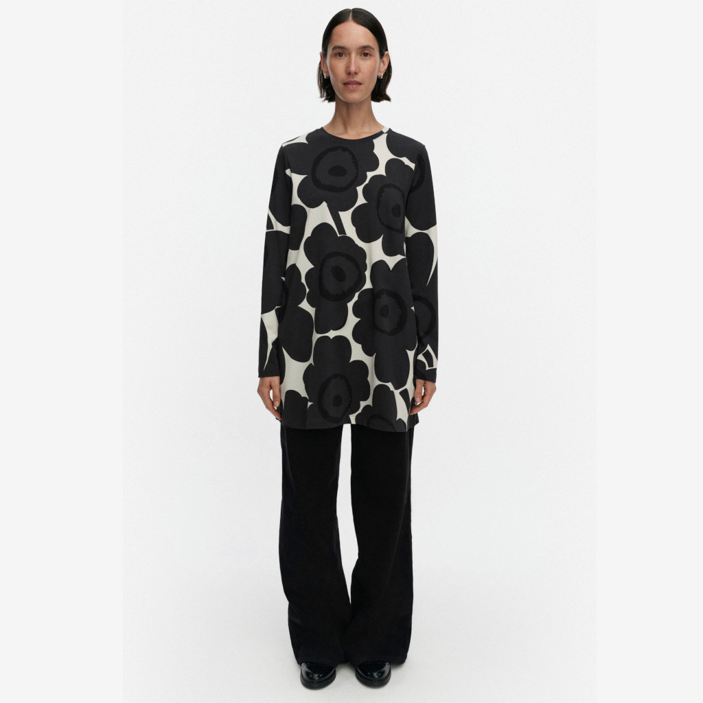 Kevät-tunika on valmistettu luomupuuvillatrikoosta ja siinä on niukka istuvuus, A-linjainen leikkaus ja Unikko-kuosi. Tunikassa on omalla kankaalla viimeistelty pyöreä pääntie ja pitkät hihat.