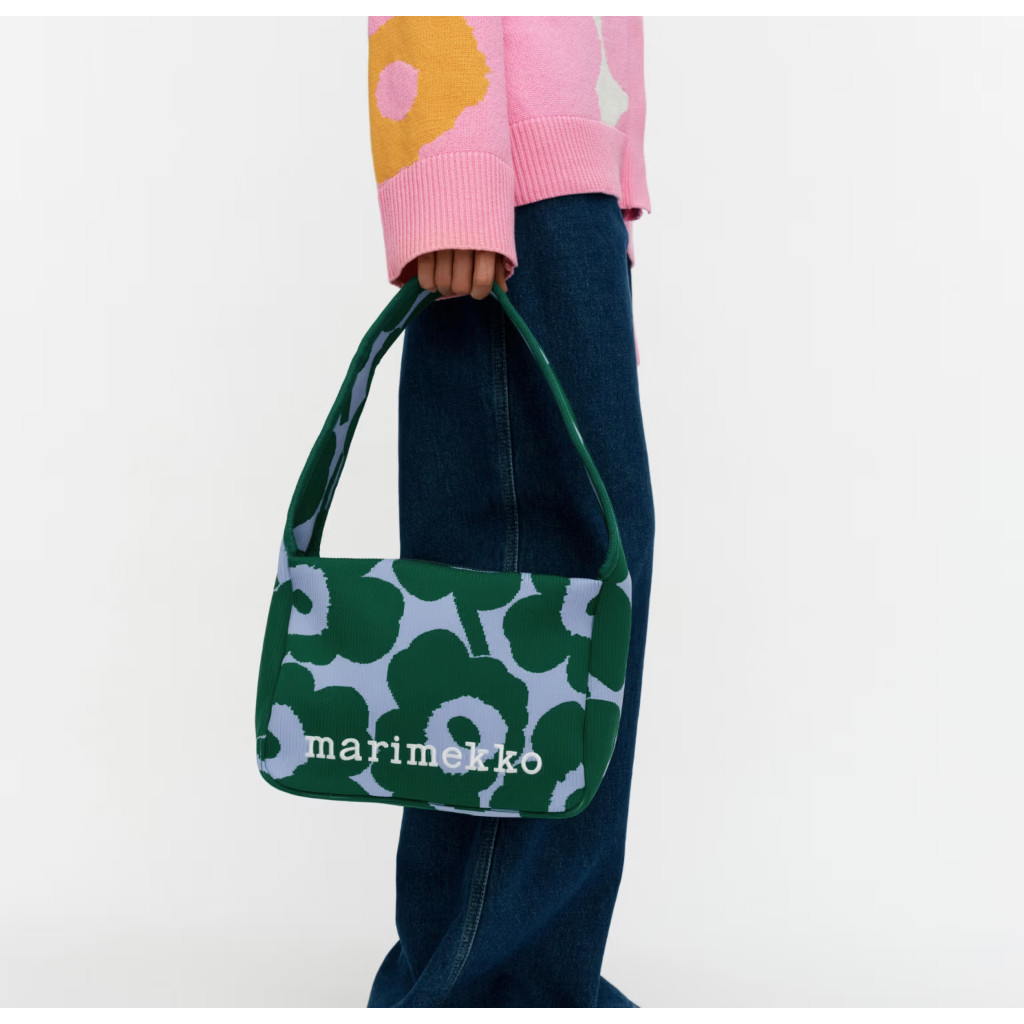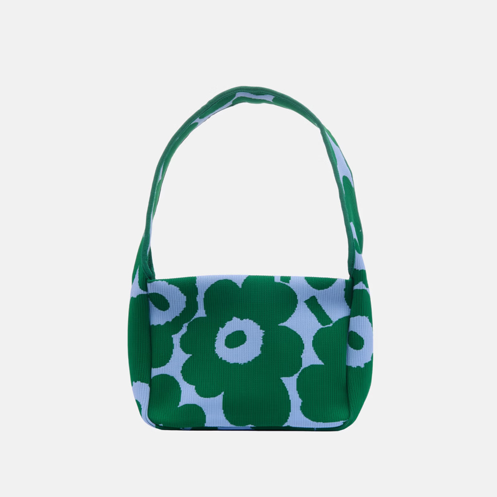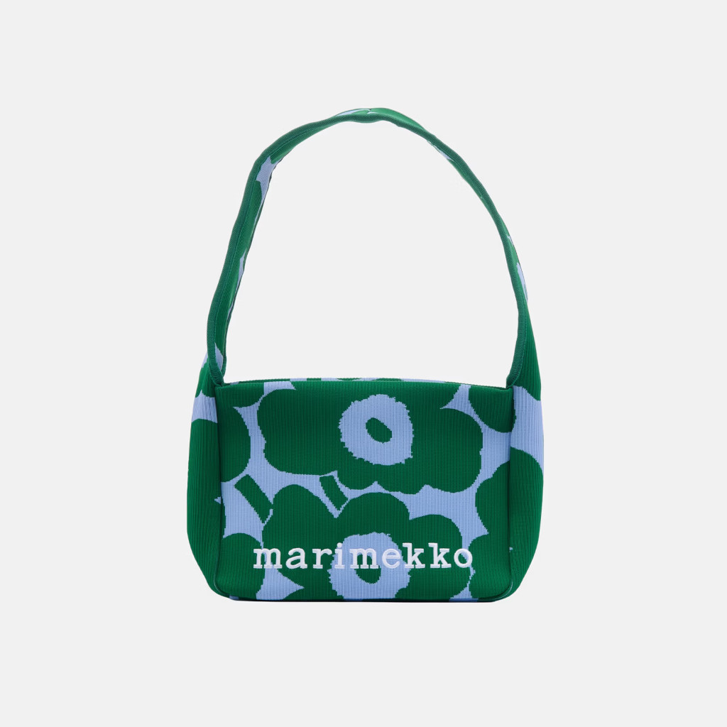 Knitted Shoulderbag -olkalaukussa on jacquard-kudottu Unikko-kuosi, ja se on valmistettu ryhdikkäästä kierrätetystä polyesterista, jossa on raidallinen pinta. Laukussa on leveä olkahihna, vetoketjusuljenta ja brodeerattu Marimekko-logo etupuolella.