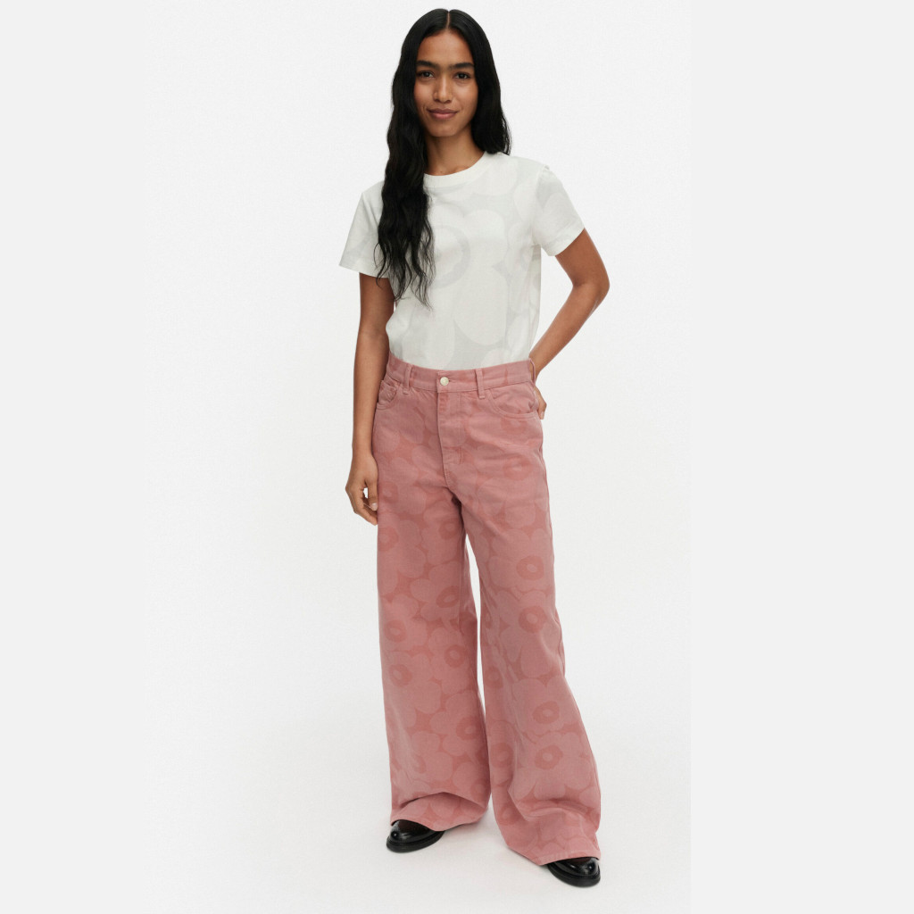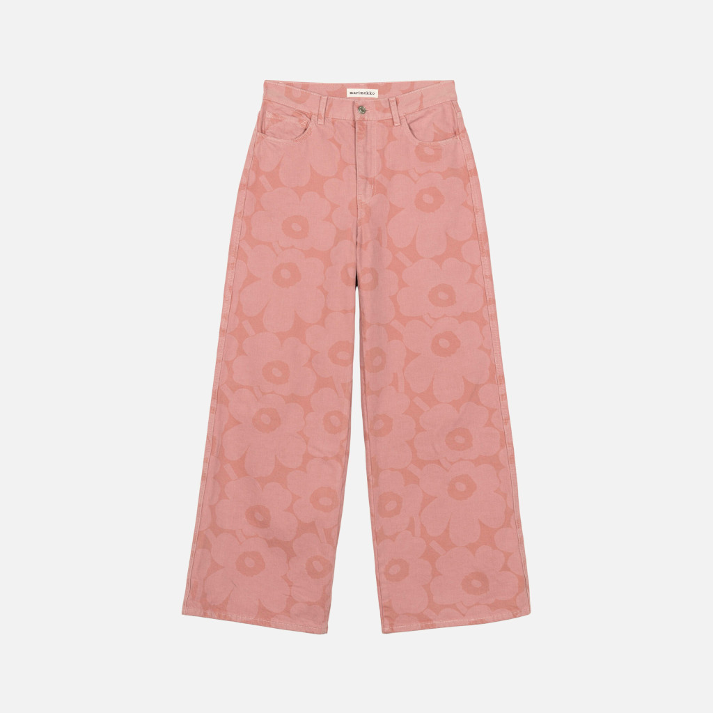 Vaaleanpunaiset, Unikko-kuosiset Maridenim Wide -farkut on valmistettu puuvillakankaasta, joka ei sisällä elastaania. Farkut ovat 5-taskumallia ja niissä on korkea, istuva vyötärö ja leveät, täyspitkät lahkeet. Farkuissa on Marimekko-farkkunapit ja Marimekko-farkkumerkki takana, joka on valmistettu FSC-sertifioidusta jacron-materiaalista.