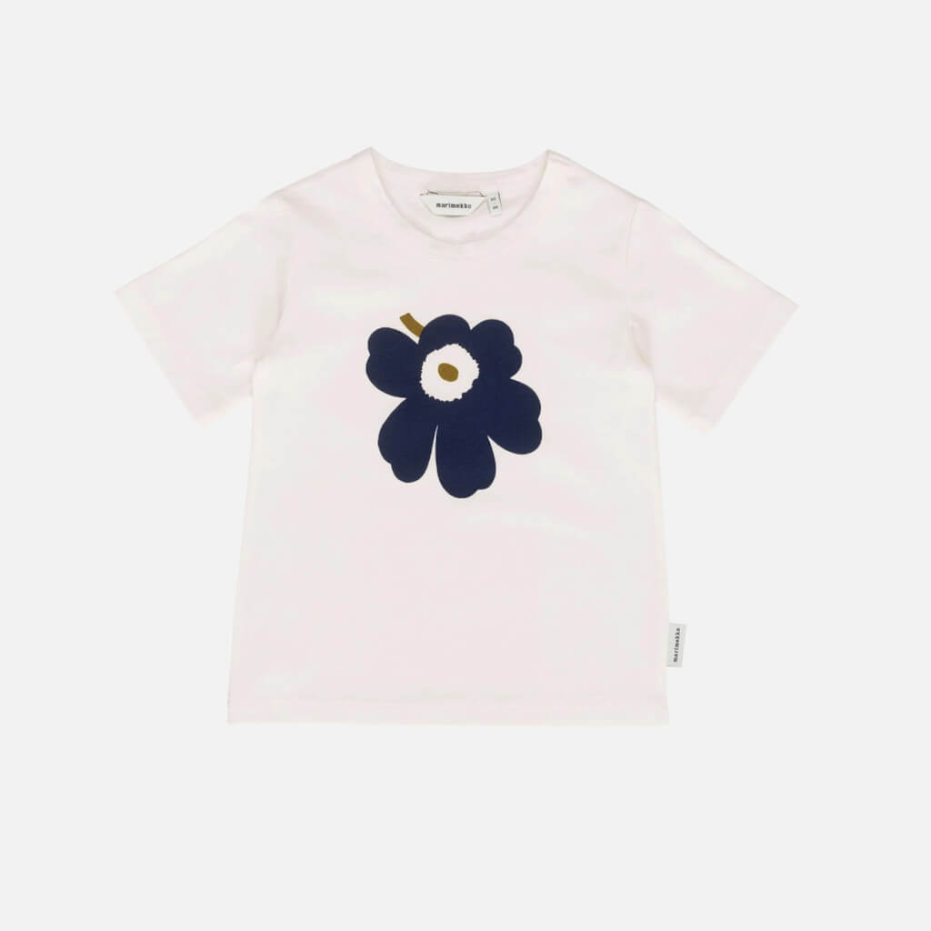 Lasten ihana T-paita valkoinen pohjaväri, tumma sininen Unikko keskellä edessä,