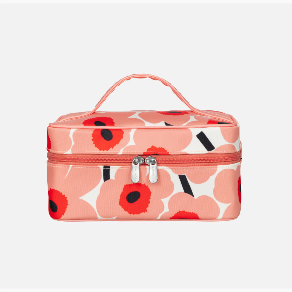 Tuttu-kosmetiikkalaukussa on Mini Unikko-kuosi ja siinä on kantokahva sekä vetoketjusuljenta. Sisäpuolelta laukku on vuoritettu ja siellä on paikat siveltimille.