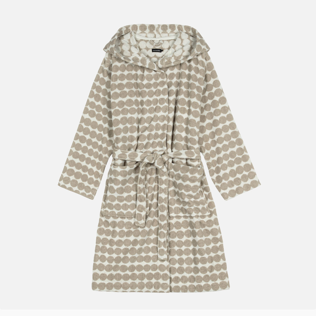 Beigevalkoisella räsymatto- kuosilla, puuvillafroteinen kylpytakki. Kylpytakissa on huppu, irroitettava vyö ja suuret taskut edessä. Takin sisäpuoli on väriltään negatiivi ulkopuolesta, antaen kylpytakille hauskan ilmeen.