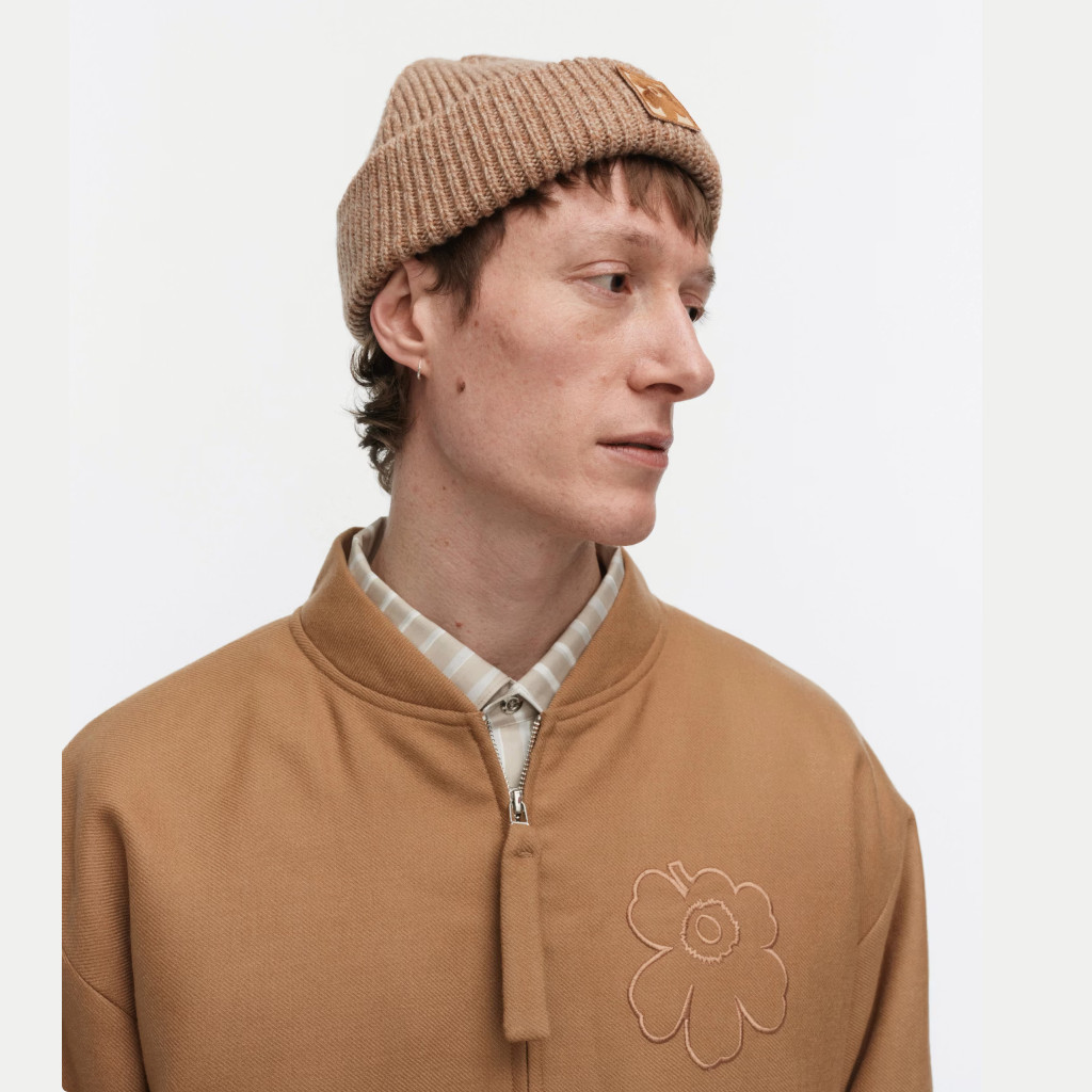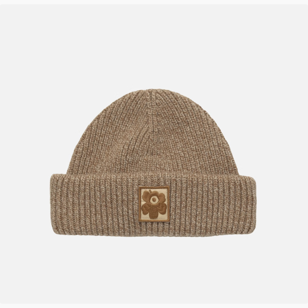 Roihua-kalastajapipo on neulottu villasta. Pipossa on leveä käänne ja brodeerattu Unikko-kukka etupuolella.