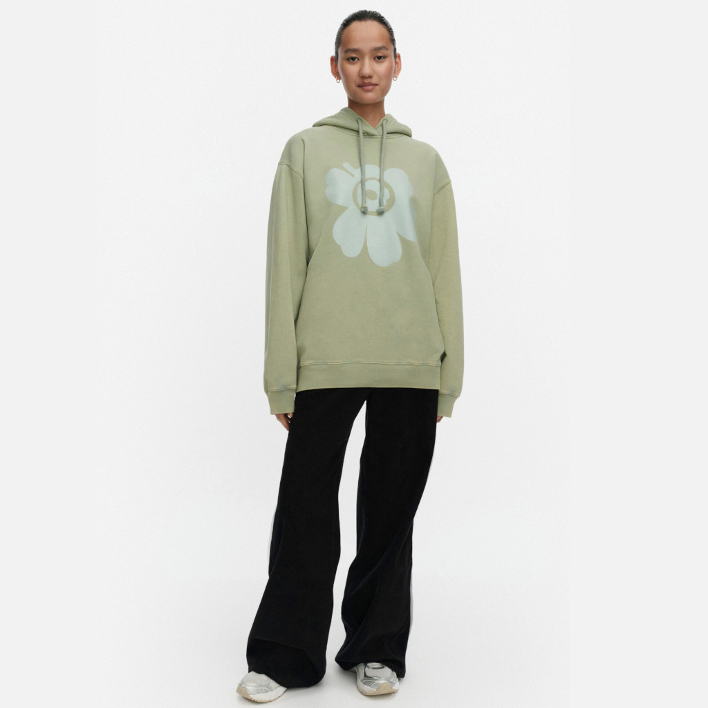 Sanoma-hupparissa on rento istuvuus ja unisex-mitoitus. Etupuolelle on painettu suuri Unikko-kukka, hupussa on solmimisnauhat ja hihansuissa sekä helmassa on leveät resorit.