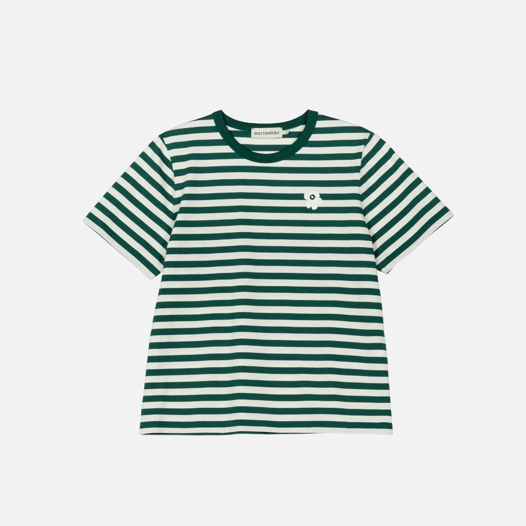 Lyhythihainen raita-paita on valmistettu puuvillatrikoosta ja siinä on rento istuvuus. Paidassa on Tasaraita-kuosi ja rintaan on painettu pieni Unikko-kuosin kukka. Pyöreä pääntie on viimeistelty resorilla.