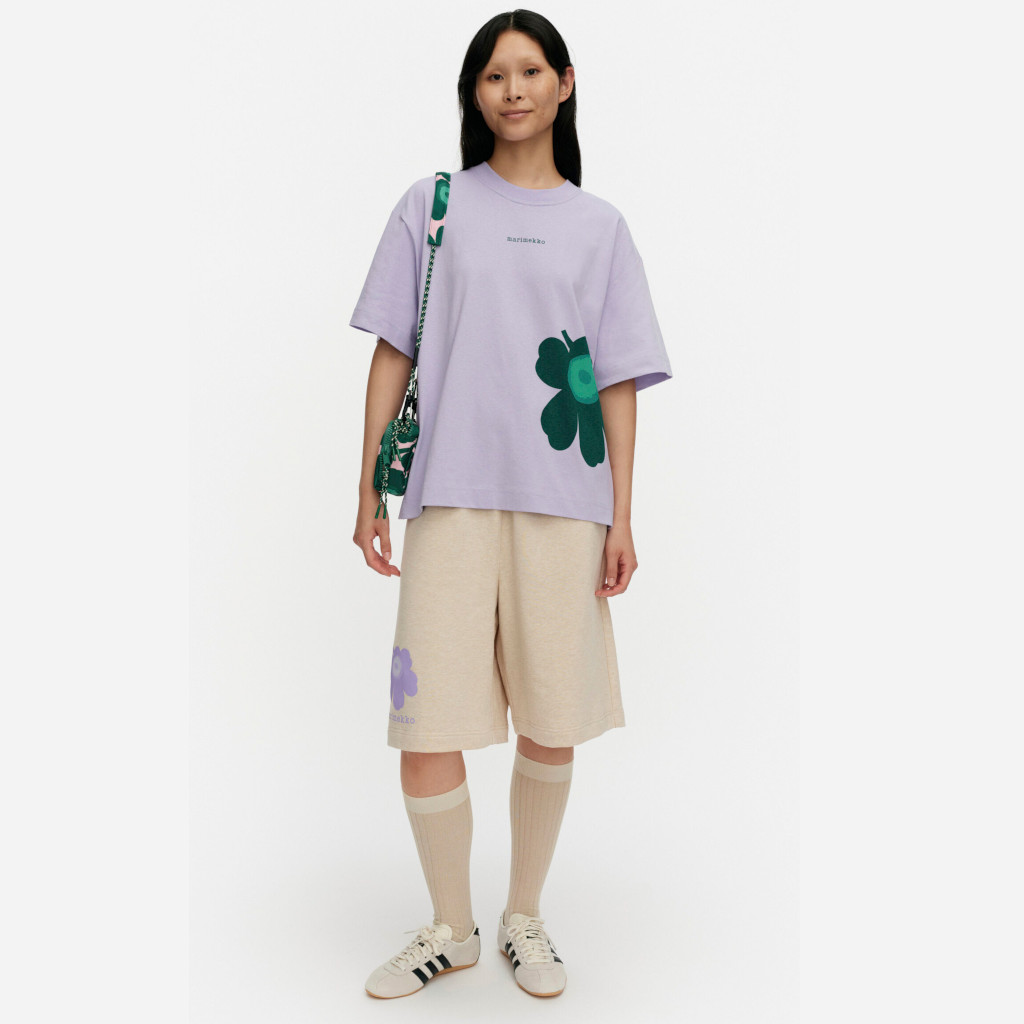 Tunti-t-paidassa on väljä istuvuus. Pyöreässä pääntiessä on leveä resori ja etupuolelle on painettu Marimekko-logo sekä Unikko-kukka.
