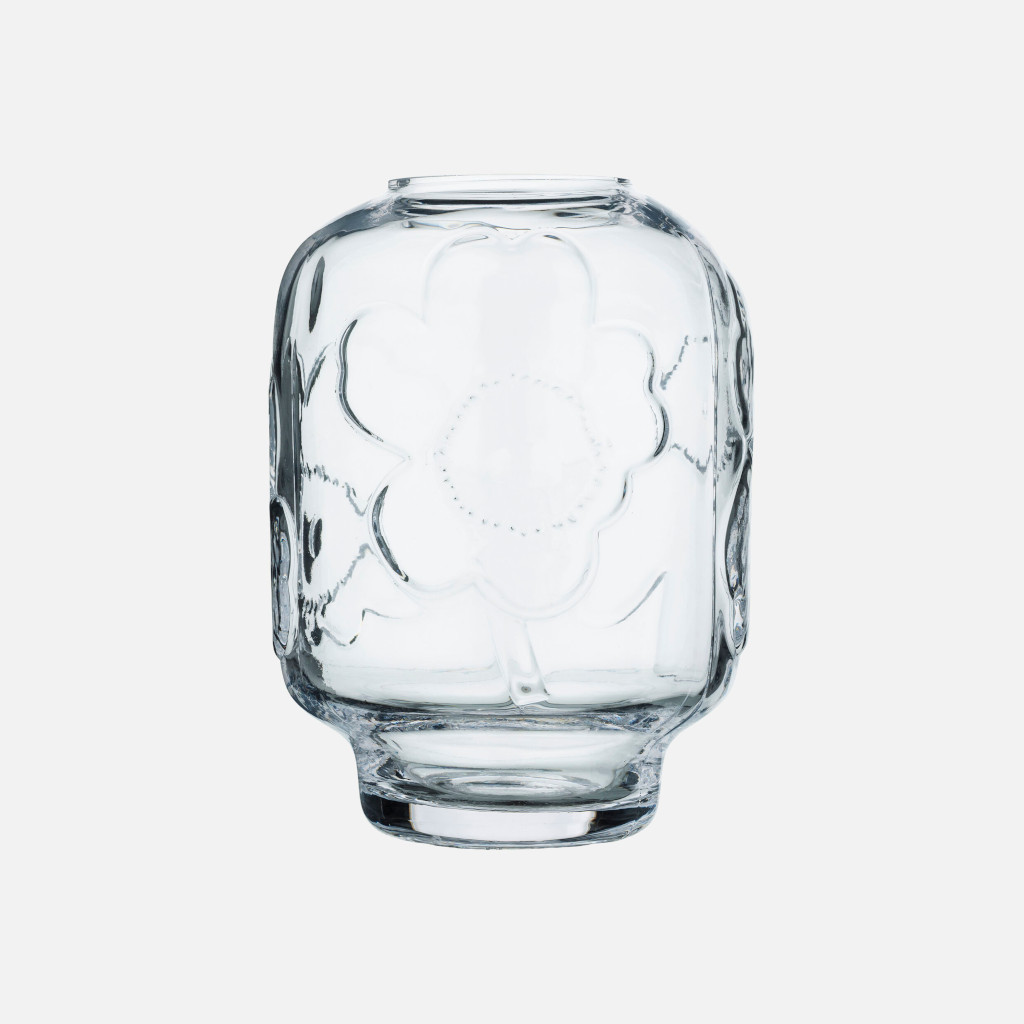 Lasimaljakossa on Unikko-kohokuvio. Suosittelemme maljakolle käsinpesua.
